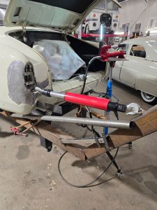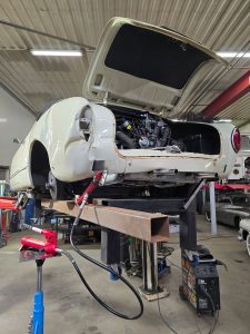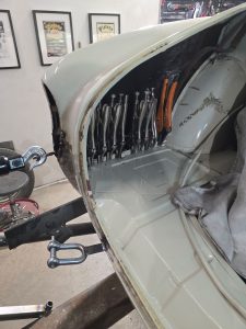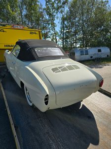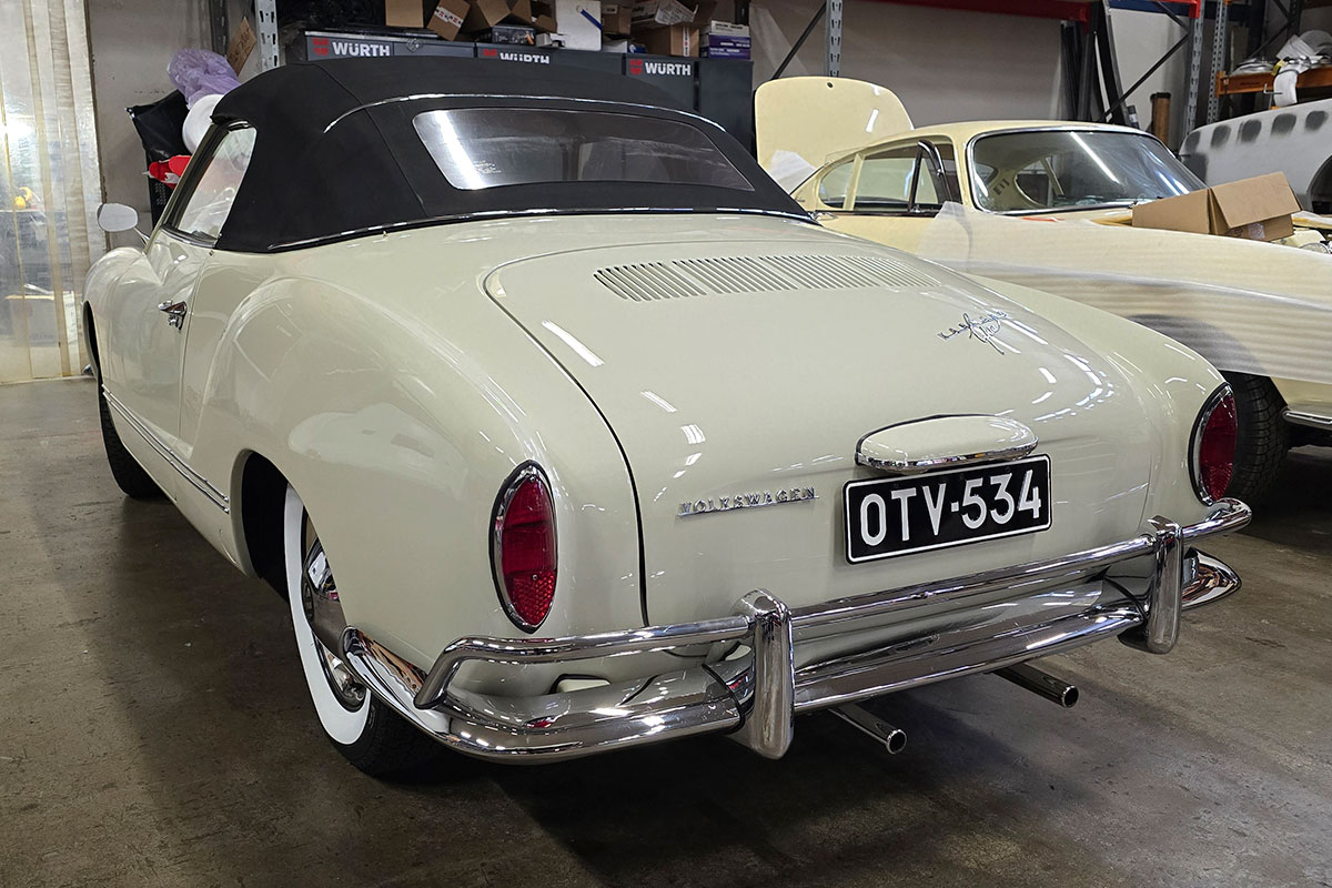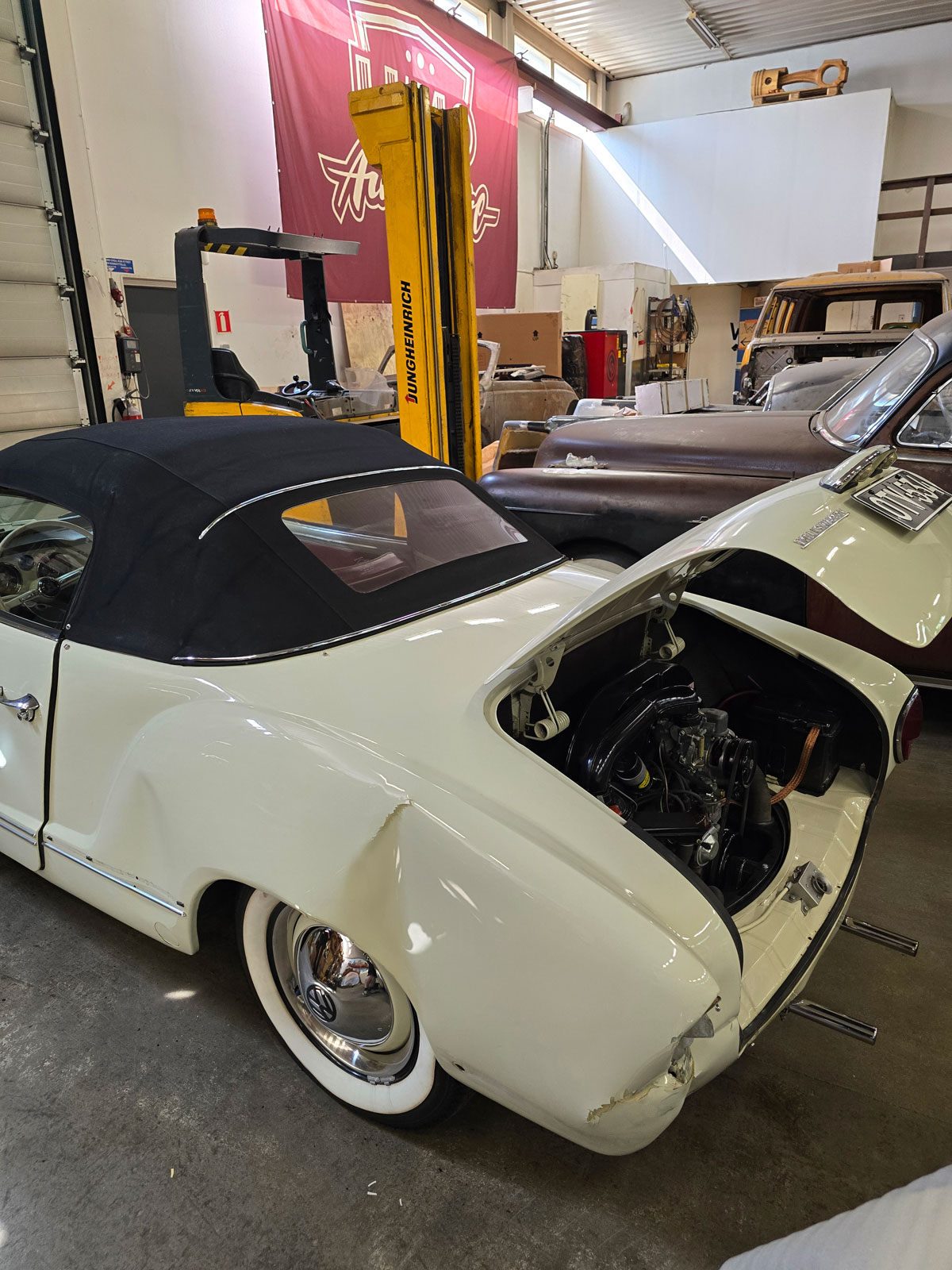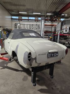 Karmann Ghiaan on tehty takakyljen vauriokorjaukset, mikä piti sisällään peltiosien ja puskurin oikomistyön ja vaihdettujen osien sovitukset. Tämän jälkeen korjatut korin osat on maalattu. Maalausprosessi lähtee värisävyjen skannauksesta, minkä jälkeen koemaalauksella vielä varmistetaan sävyjen korrektius ennen lopullista maalausta. Oikaistu ja korjattu puskuri on kromattu uudelleen.